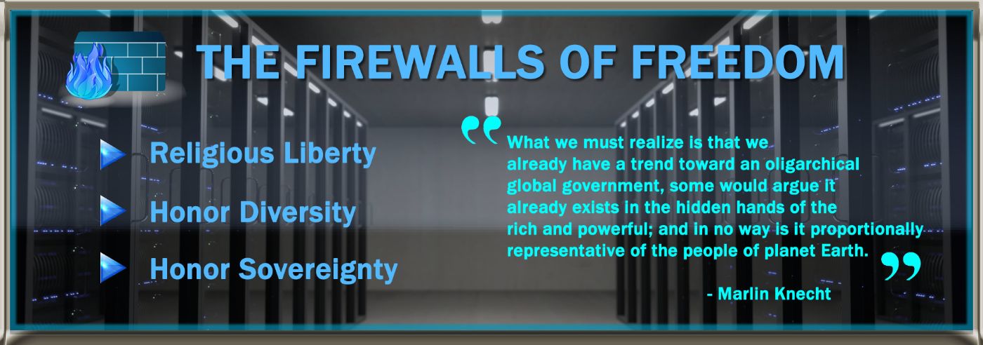 Firewalls of Freedom allow us to ensure the rights of the planetary citizen, while preserving the rich cultures, histories and more that exist in the world’s diverse populations. It is a firm statement that puts a firewall in place against the concerns associated with top down governance; while answering this reality with a government of the people. This allows us to move forward, and establish a Planetary Management System - manage planetary resources, develop ongoing sustainability and increase the standard of living for people all over the planet.