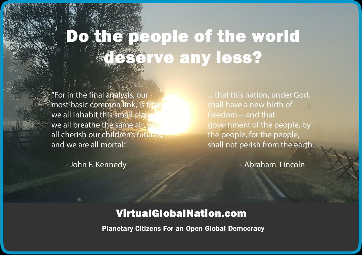 In the Virtual Global Nation, anyone who lives on Planet Earth is a Planetary Citizen, and as such, a stakeholder in issues from climate change to clean energy to food security to access to clean water to access to economic opportunity.