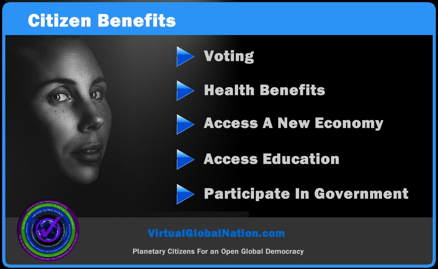 Joining the Virtual Global Nation carries with it many benefits these include becoming part of a new planetary economy, health benefits as a citizen, voting and more.